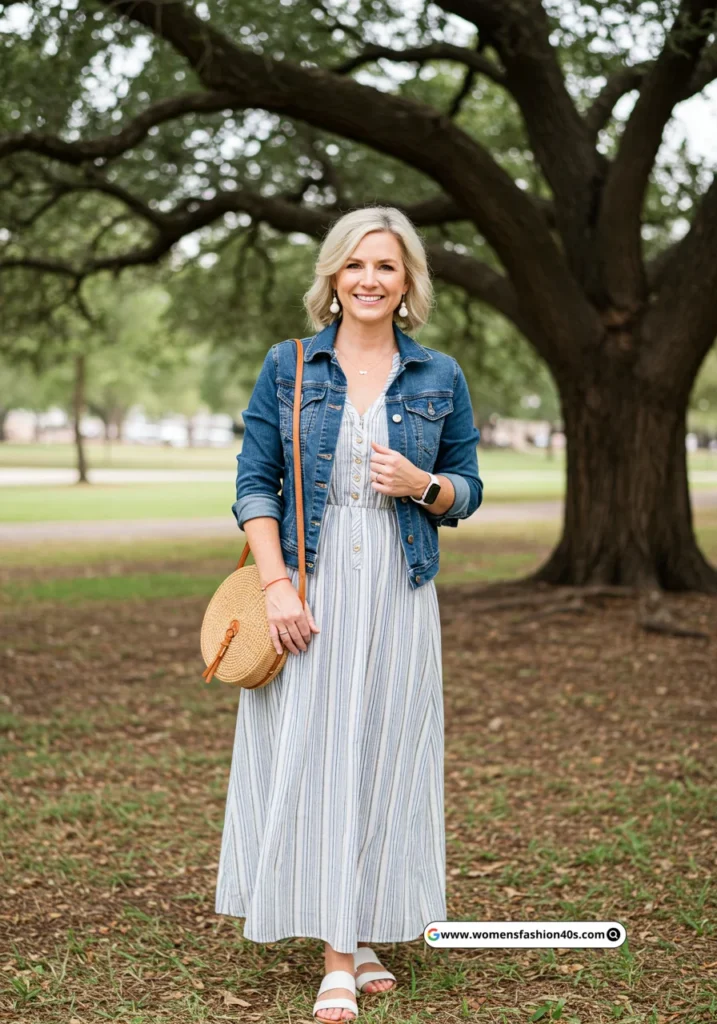 10. Denim Jacket with Striped Maxi Dress