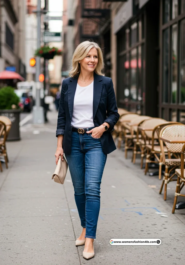 I wore this to a quick lunch meeting in New York. Statista notes blazers paired with tees and jeans are popular for moms balancing professional and casual vibes.