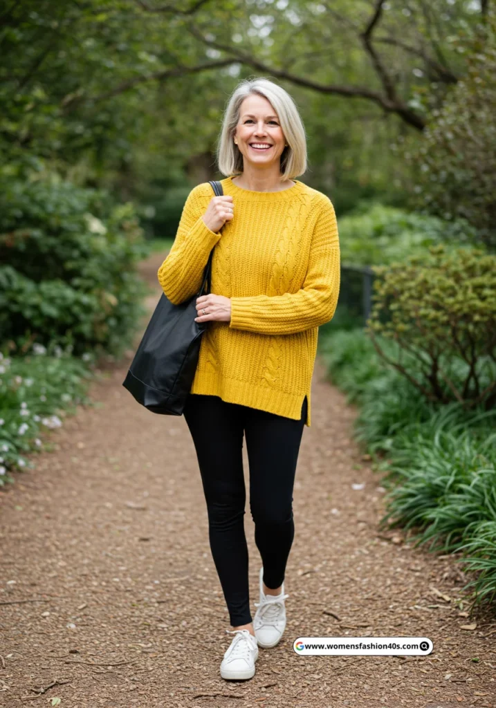 This cheerful outfit was perfect for a Saturday morning school run in Seattle. Pinterest shows bright sweaters with leggings are increasingly saved for uplifting and easy looks.