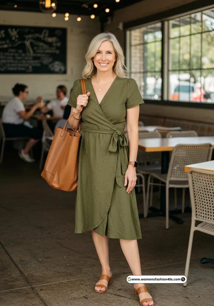Shop Now from Amazon: Olive Wrap Dress + Tan Sandals + Brown Tote Bag