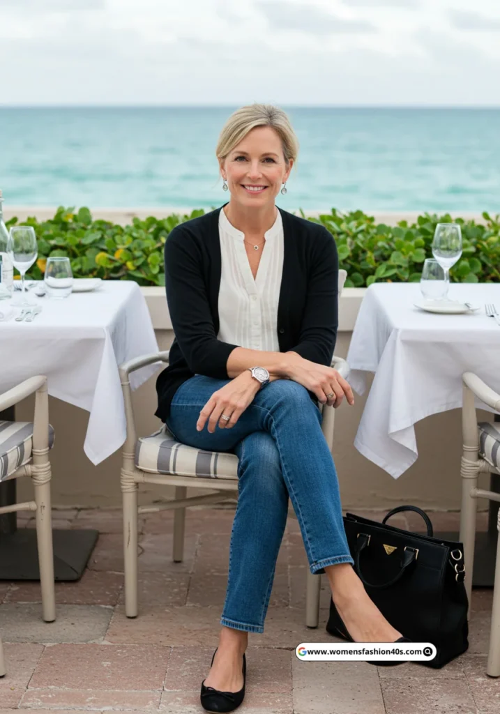 For a casual dinner in Miami, this outfit felt sophisticated yet relaxed. Statista indicates cardigans layered over blouses remain a top search for easy mom styling.