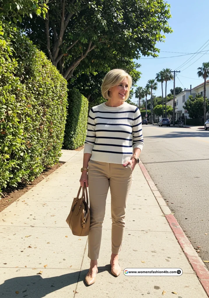 I tried this during a weekend getaway in Los Angeles. Pinterest shows striped sweaters with neutral pants as a top choice for casual chic outfits.