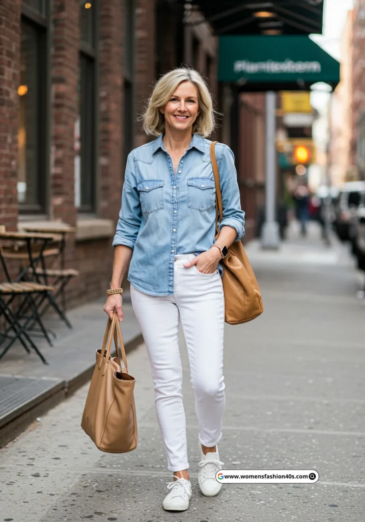 I wore this for a coffee date in New York. Google Trends confirms chambray shirts paired with white jeans are popular for effortless mom outfits.