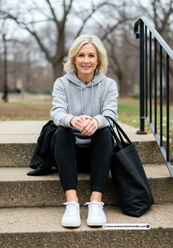 Perfect for a casual weekend with the kids in Seattle, this outfit balances comfort and style. Pinterest Trends shows hoodie and jogger sets are increasingly saved for easy, chic casual mom outfits.