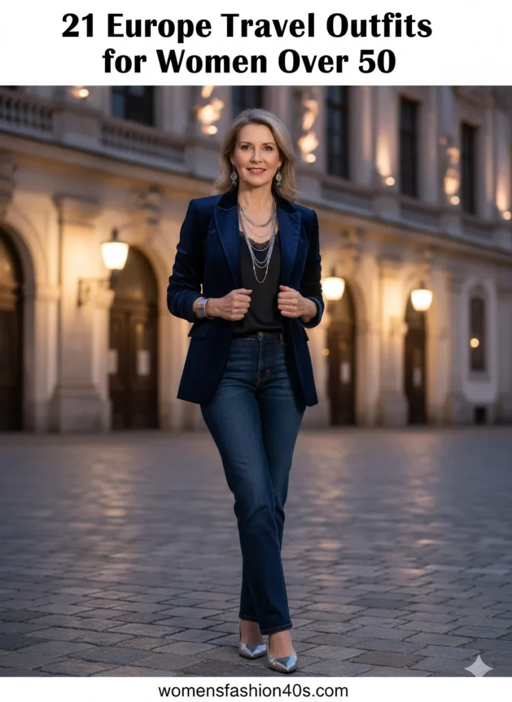 Shop Now From Amazon: (Navy Velvet Blazer) + (Black Silk Camisole) + (Dark Denim Jeans) + (Silver Pointed Flats) For a night at the symphony, I suggest mixing luxurious textures. This velvet blazer adds a touch of elegance to casual denim, creating a balanced, confidence-boosting outfit that feels special without being overly formal for European nights.