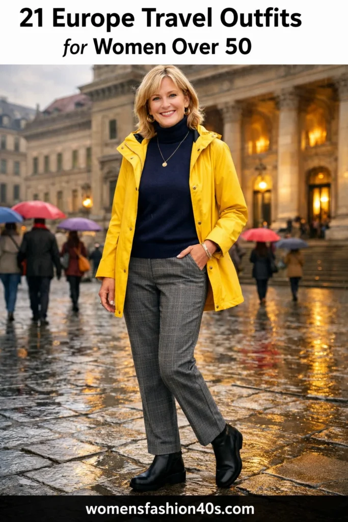 Shop Now From Amazon: (Yellow Rain Slicker) + (Navy Turtleneck) + (Grey Plaid Trousers) + (Black Waterproof Booties) Don’t let the rain dampen your style. I love how this bright pop of color boosts the mood, while the plaid trousers keep the look grounded in traditional European sophistication and practical, weather-appropriate comfort for museum hopping.