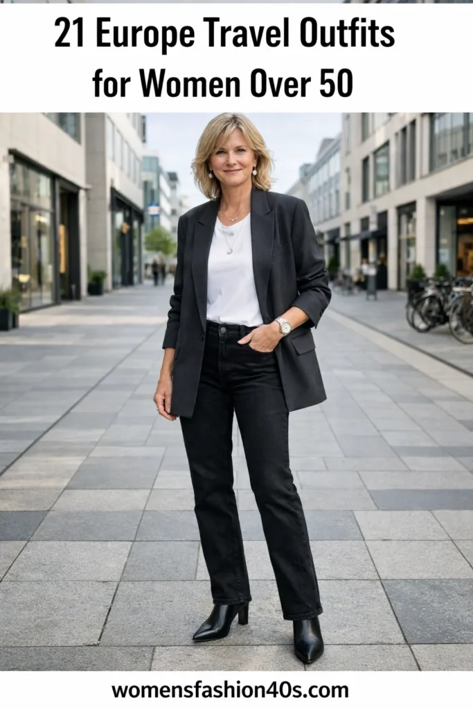 Shop Now From Amazon: (Charcoal Oversized Blazer) + (White T-shirt) + (Black Straight-Leg Jeans) + (Black Pointed Boots) I often look to Scandinavian style for minimalist inspiration. This blazer-centric look offers a structured, modern vibe that feels incredibly high-end, proving that simple basics can create a truly powerful and fashionable travel statement for any city.