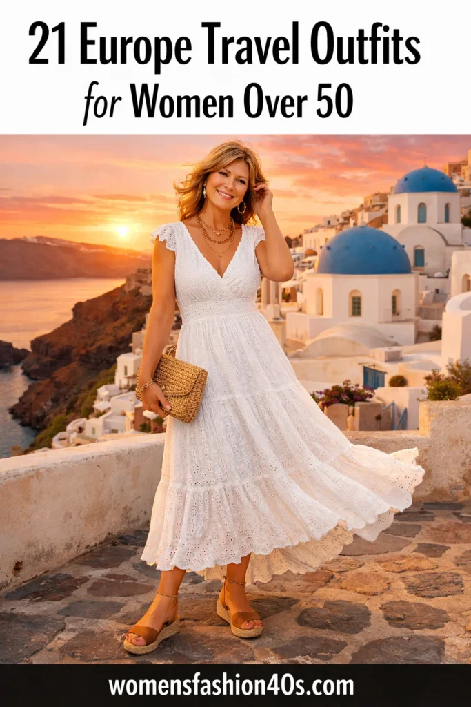 Shop Now From Amazon: (White Eyelet Maxi Dress) + (Tan Espadrilles) + (Woven Clutch Bag) I adore the romantic feel of eyelet lace against a Mediterranean backdrop. This airy dress provides a flattering, breezy fit that ensures you feel radiant and comfortable while watching the sun dip below the horizon in Santorini.