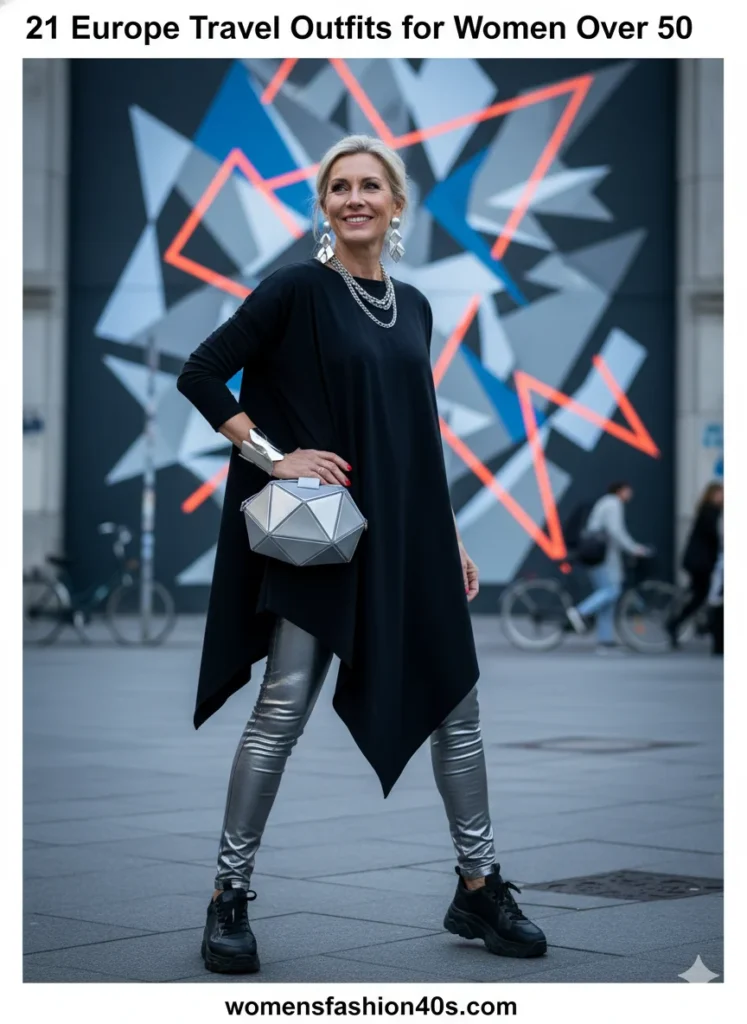 Shop Now From Amazon: (Black Asymmetrical Tunic) + (Silver Metallic Leggings) + (Black Platform Sneakers) + (Geometric Bag) For the fashion-forward traveler, I recommend experimenting with proportions. This asymmetrical top is uniquely flattering, creating an edgy, modern silhouette that’s perfect for visiting contemporary art spaces or exploring the trendier districts of major European cities.