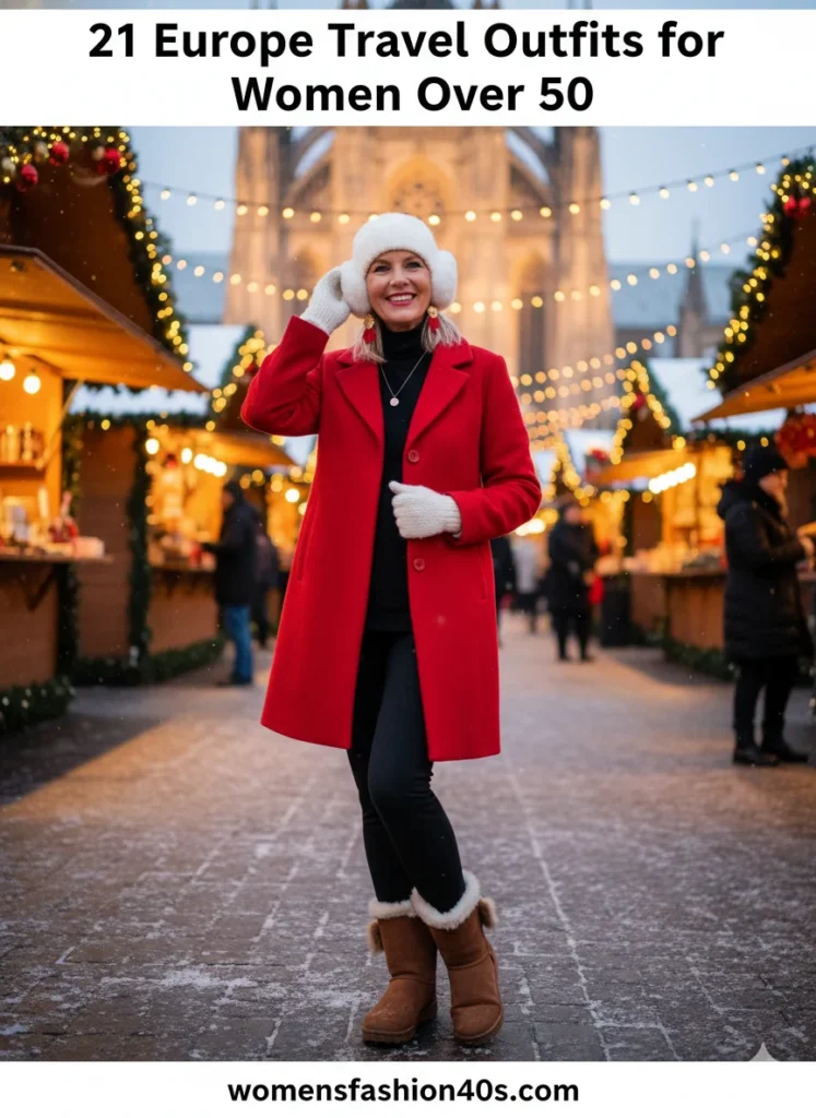 Shop Now From Amazon: (Red Wool Coat) + (Black Thermal Leggings) + (Faux Fur Trimmed Boots) + (White Beanie) Festive travels require vibrant colors. I love how this bold red coat stands out against snowy backdrops, providing a flattering pop of color while the thermal layers keep you incredibly warm and cozy during Christmas market visits.