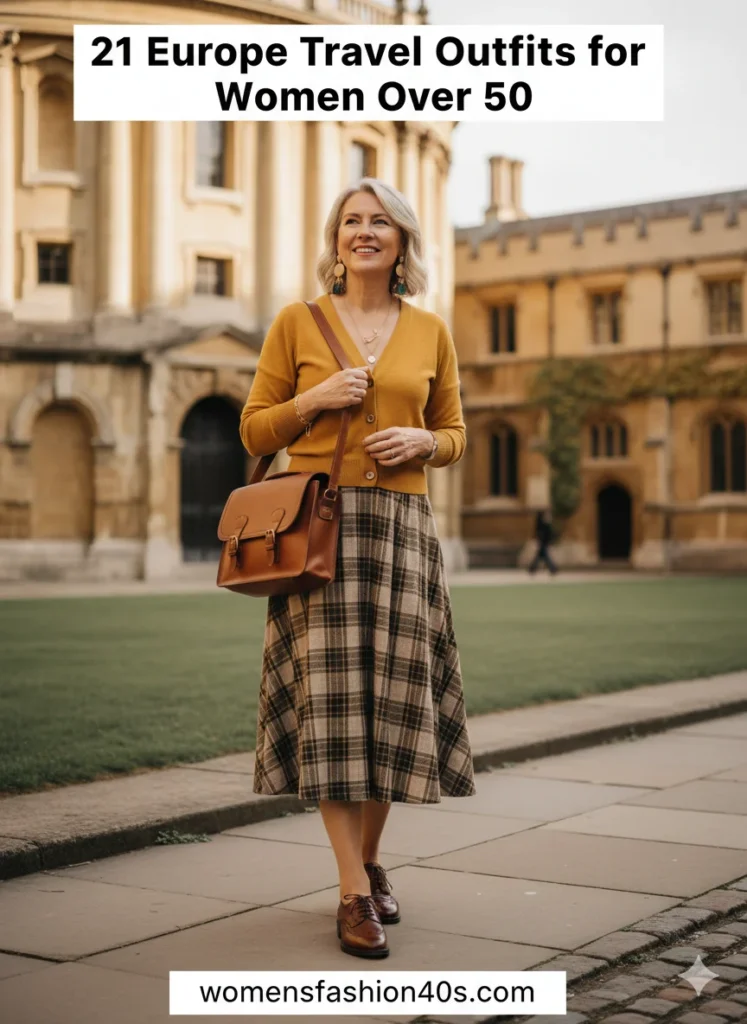 Shop Now From Amazon: (Mustard Yellow Cardigan) + (Plaid Midi Skirt) + (Brown Brogues) + (Leather Satchel) I love the academic charm of this “dark academia” inspired look. The rich mustard hue adds warmth, while the structured skirt provides a flattering, modest length that’s perfect for exploring Europe’s most beautiful and historic libraries.