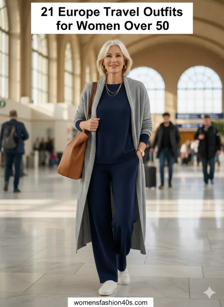 Shop Now From Amazon: (Navy Knit Lounge Set) + (Grey Long Cardigan) + (White Slip-on Sneakers) + (Large Leather Tote) Travel days demand maximum comfort. I recommend this coordinated knit set for a “put-together” look that feels like pajamas but looks like high-end loungewear, ensuring you arrive at your European destination feeling rested and stylish.
