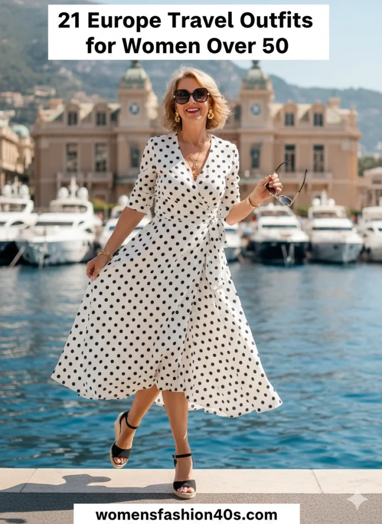 Shop Now From Amazon: (Polka Dot Wrap Dress) + (Black Wedge Sandals) + (Oversized Sunglasses) Channeling vintage film stars, this polka dot ensemble is a personal favorite. The wrap style is exceptionally flattering for all figures, offering a timelessly feminine look that feels both playful and incredibly sophisticated for the French Riviera.