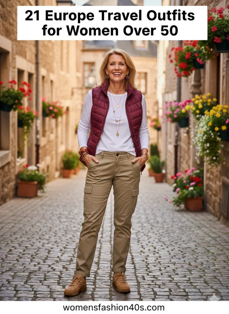 Shop Now From Amazon: (Burgundy Quilted Vest) + (White Long-Sleeve Tee) + (Khaki Cargo Pants) + (Tan Walking Shoes) Practicality meets trend with these refined cargo pants. I’ve styled this for long walks through historic quarters, ensuring you stay warm and mobile while maintaining a polished, sporty silhouette that looks fantastic in your travel photos.