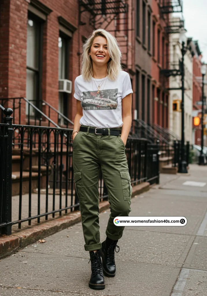 Shop Now from Amazon: Olive Green Cargo Pants + White Graphic Tee + Black Combat Boots