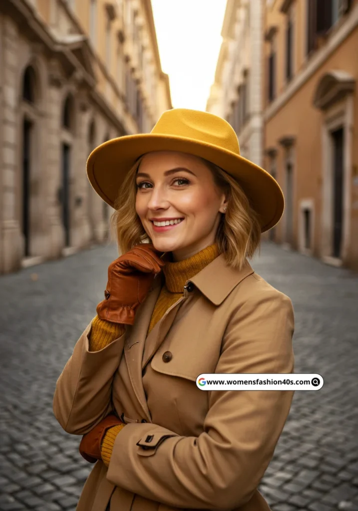 The mustard yellow wool fedora is a bold accessory that adds a pop of color to any outfit. I love how it looks with the beige trench coat, creating a chic and sophisticated ensemble. The brown leather gloves add warmth and elegance, making this outfit perfect for a day out in the city.
