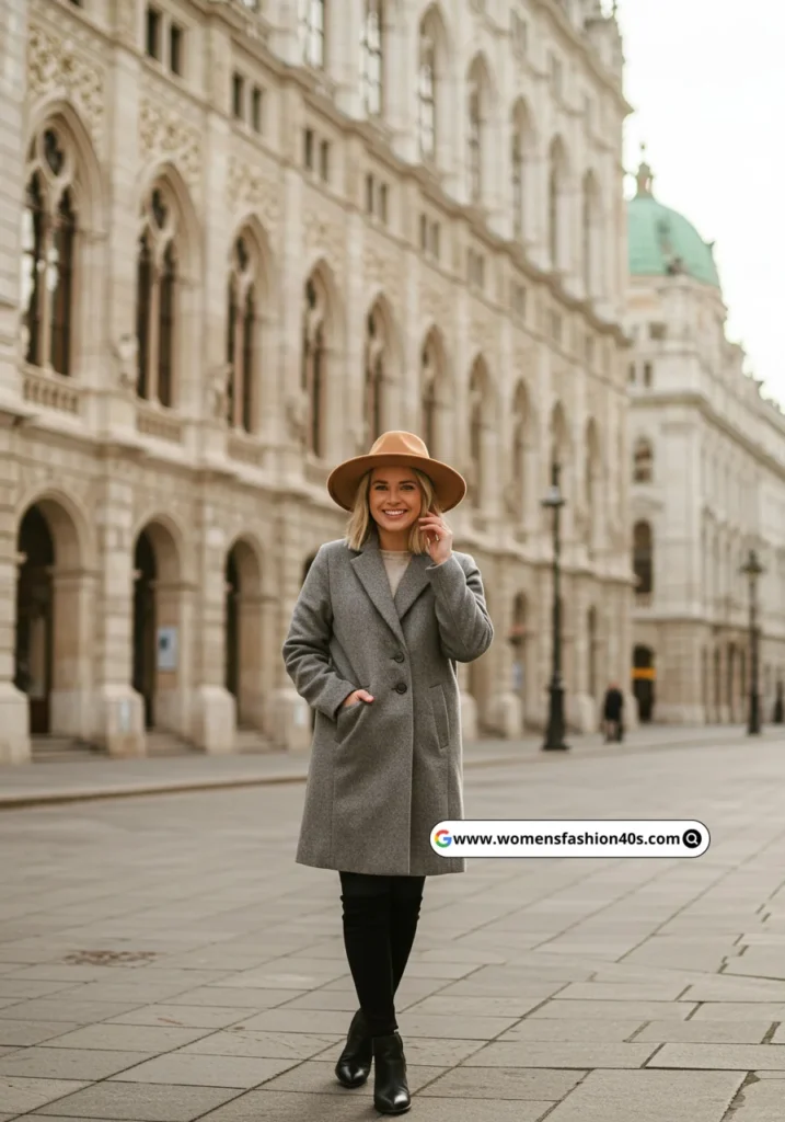 The camel wool fedora is a stylish accessory that adds a touch of elegance to any outfit. I love how it pairs with the grey wool coat and black leather boots, creating a balanced and chic look. This ensemble is perfect for a day out in the city or a casual outing with friends.