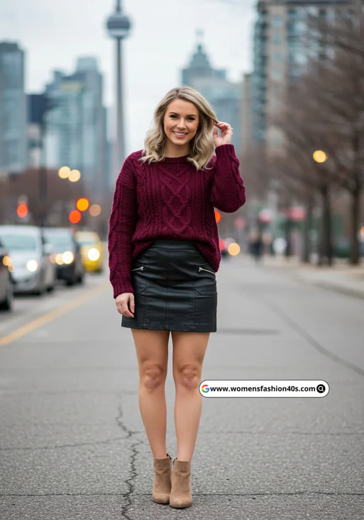 Shop Now from Amazon: Burgundy Cable-Knit Sweater + Black Leather Skirt + Tan Ankle Boots
