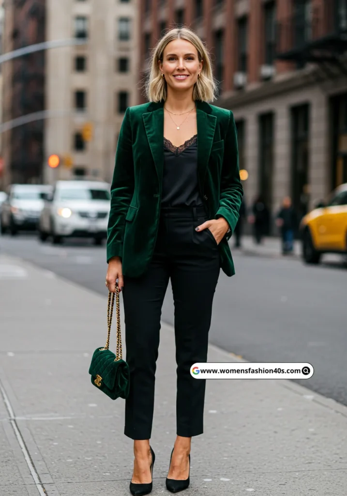 Shop Now from Amazon: Forest Green Velvet Blazer + Black Silk Camisole + Black Tailored Trousers + Black Pointed-Toe Heels + Gold Chain Bag