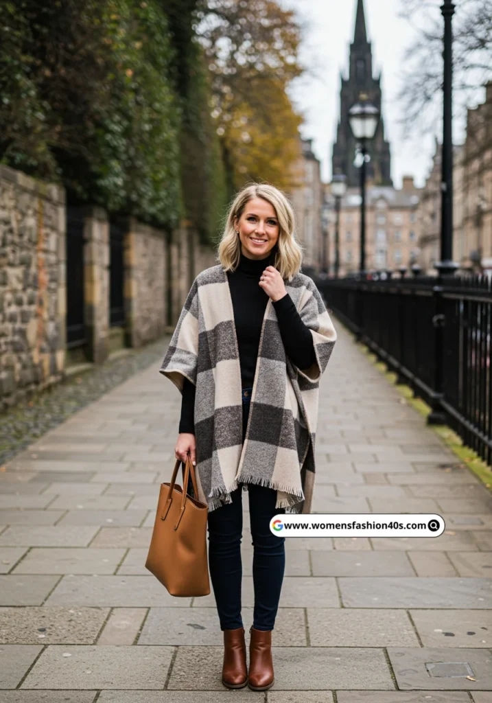 Shop Now from Amazon: Plaid Wool Poncho + Black Turtleneck + Dark Skinny Jeans + Brown Leather Ankle Boots + Tan Tote Bag