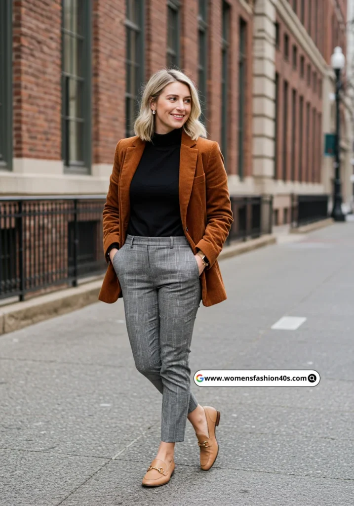 The rust corduroy blazer is a standout piece that adds texture and warmth to any outfit. I love how it pairs with the black turtleneck sweater and grey plaid trousers, creating a balanced and polished look. The tan leather loafers add a touch of elegance, making this ensemble perfect for a day at the office or a lunch meeting.
