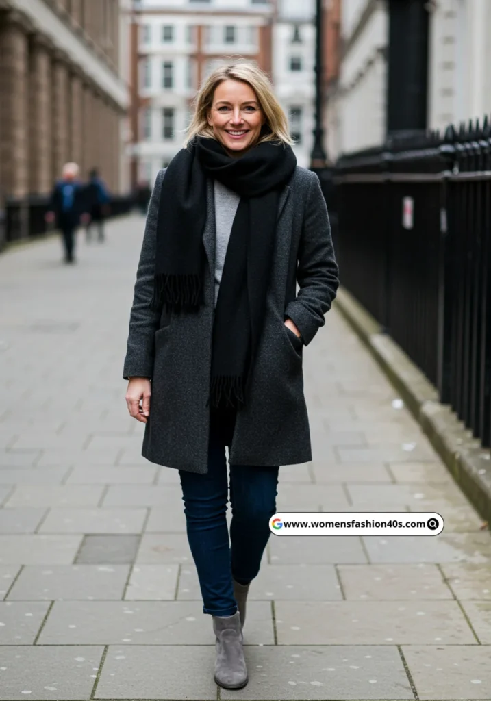 The charcoal grey wool blend coat is a classic piece that never goes out of style. Its tailored fit and neutral color make it incredibly versatile, pairing well with a variety of outfits. I love how it looks with the black cashmere scarf and dark denim jeans, creating a sleek and sophisticated ensemble. The grey suede boots add a modern touch, making this outfit ideal for both casual and semi-formal occasions.