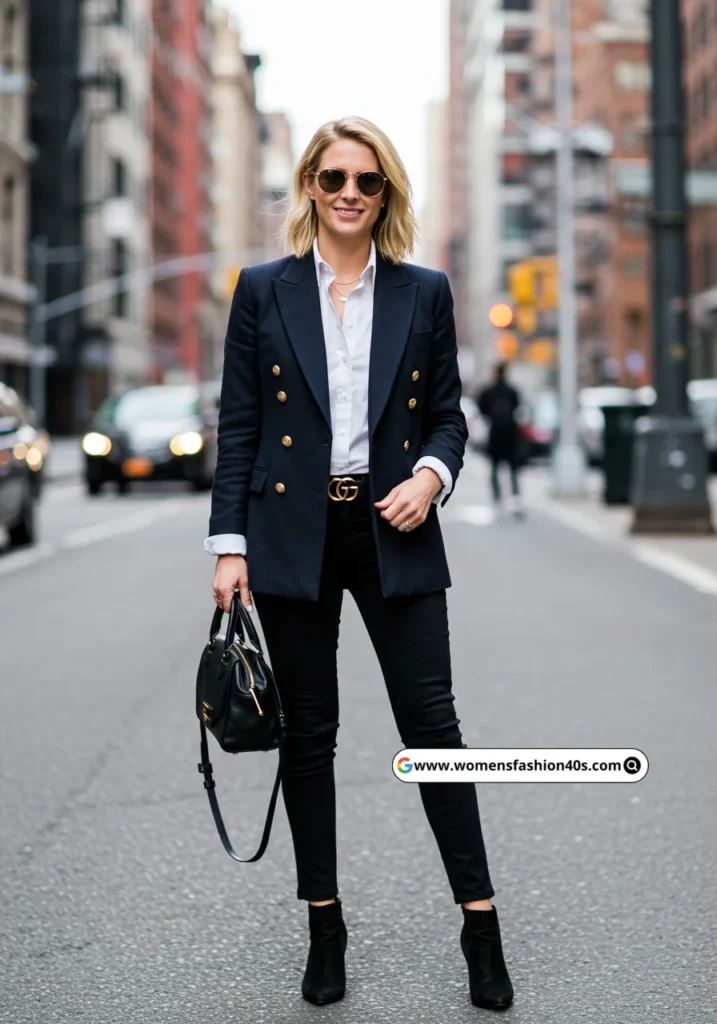 Shop Now from Amazon: Navy Blue Double-Breasted Blazer + White Button-Down Shirt + Black Skinny Trousers + Black Heeled Booties
