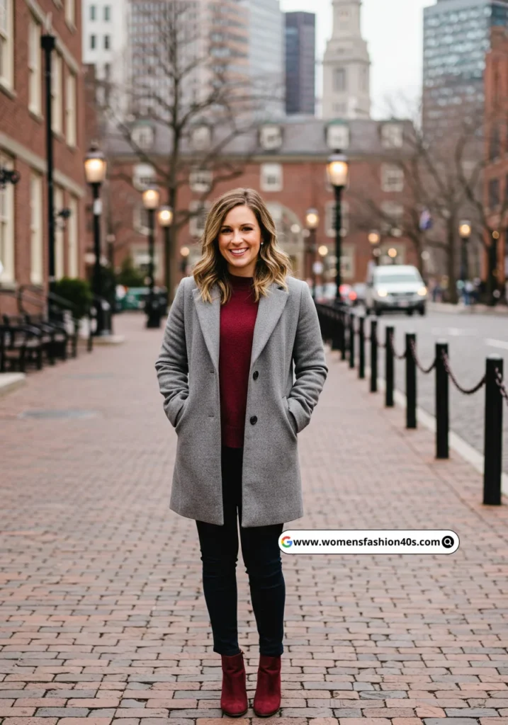 The burgundy suede ankle boots are a statement piece that adds a pop of color to any outfit. I love how they look with black skinny jeans, creating a sleek and modern silhouette. The grey wool coat adds warmth and sophistication, making this ensemble perfect for a day out in the city.