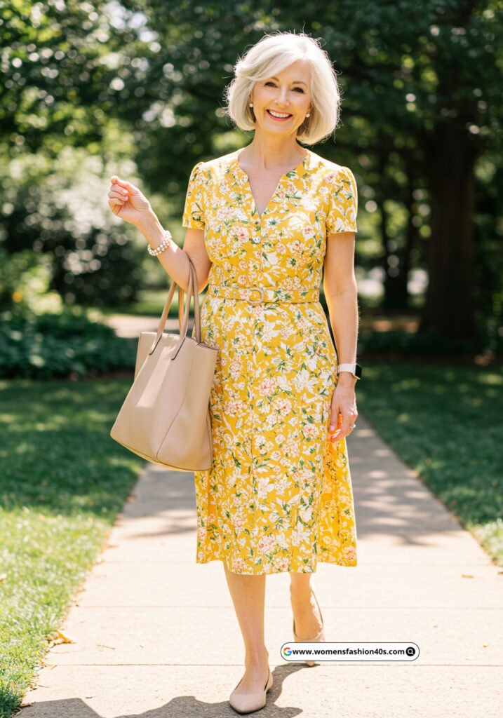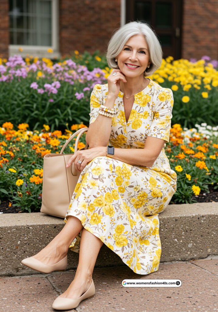 Perfect for casual brunches, the yellow florals bring a cheerful vibe. Pinterest shows yellow florals trending for uplifting, age-appropriate looks.
