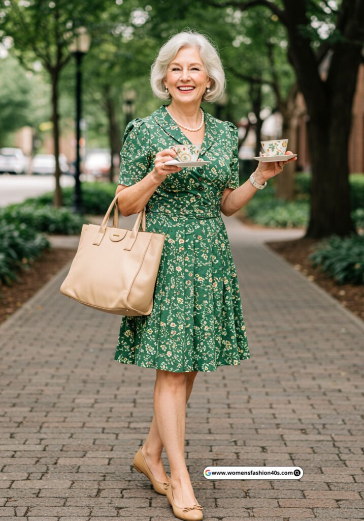 Tea parties or casual lunches—this dress is versatile. Statista shows green floral dresses trending among women 60+, balancing elegance and comfort.