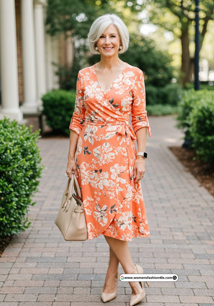 I wore this for a casual lunch date, and the wrap made movement effortless. Statista indicates white florals are trending for summer dresses in mature fashion.