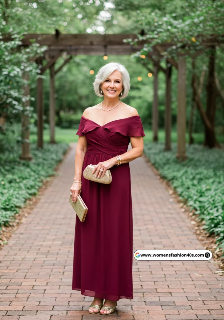 I wore this dress to a wedding in Atlanta. The off-shoulder cut provided a stylish, feminine look while keeping it age-appropriate. Pinterest Trends confirms off-shoulder maxi dresses are trending.