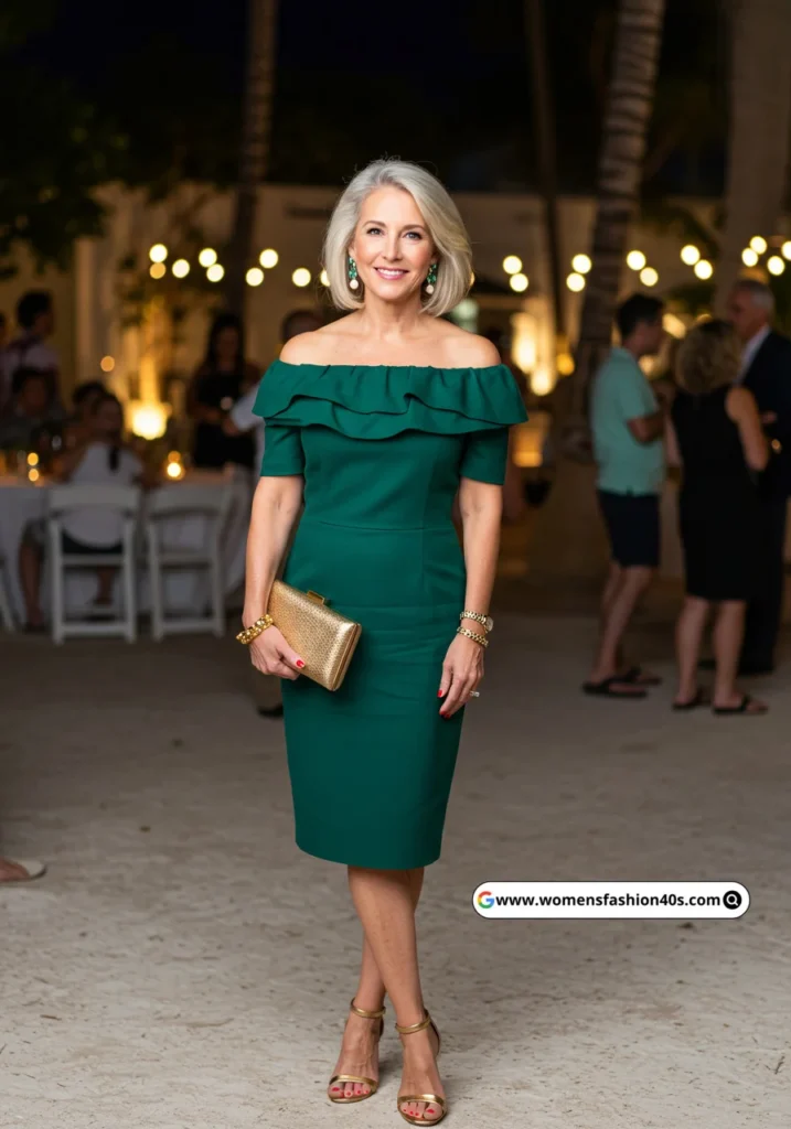 This emerald off-shoulder dress was perfect for a summer cocktail in Miami. Its vibrant hue and neckline were flattering, Pinterest reports off-shoulder formal dresses trending for mature women.