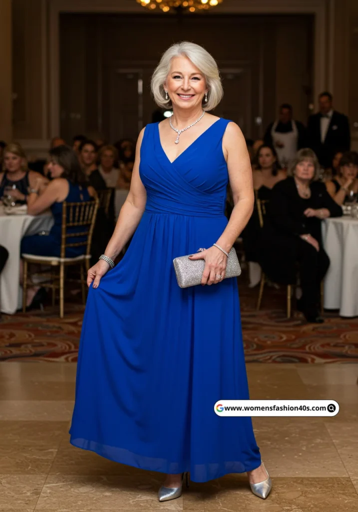 I wore this royal blue maxi for a formal dinner in Chicago. The bold color made me feel confident, stylish, and camera-ready. Vogue highlights jewel tones as flattering for mature women.
