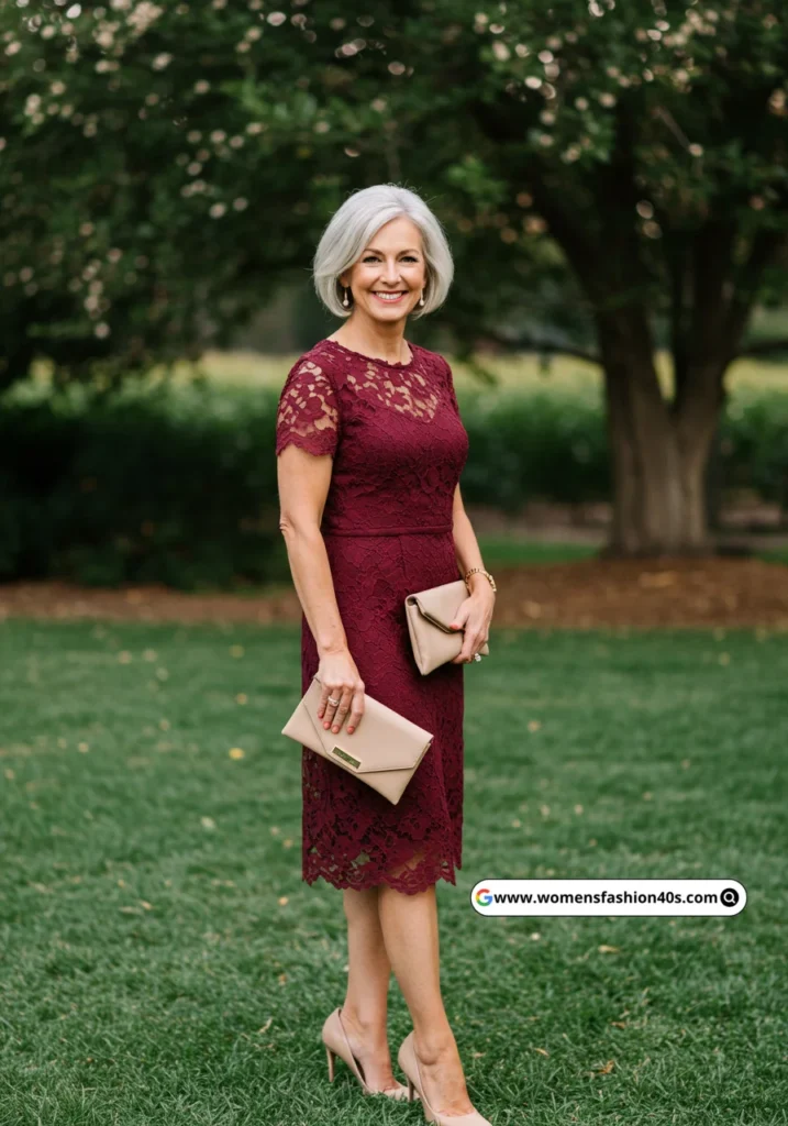 This wine lace midi dress was ideal for evening weddings. The intricate lace and flattering silhouette made me feel elegant yet comfortable. Pinterest Trends shows lace midi dresses trending for women over 50.