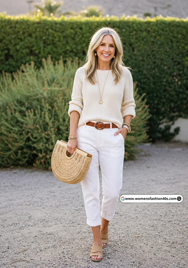 This monochrome look felt fresh in Los Angeles spring. Pinterest shows “white jeans outfits” for 40+ women trending, proving it’s still a wardrobe essential.