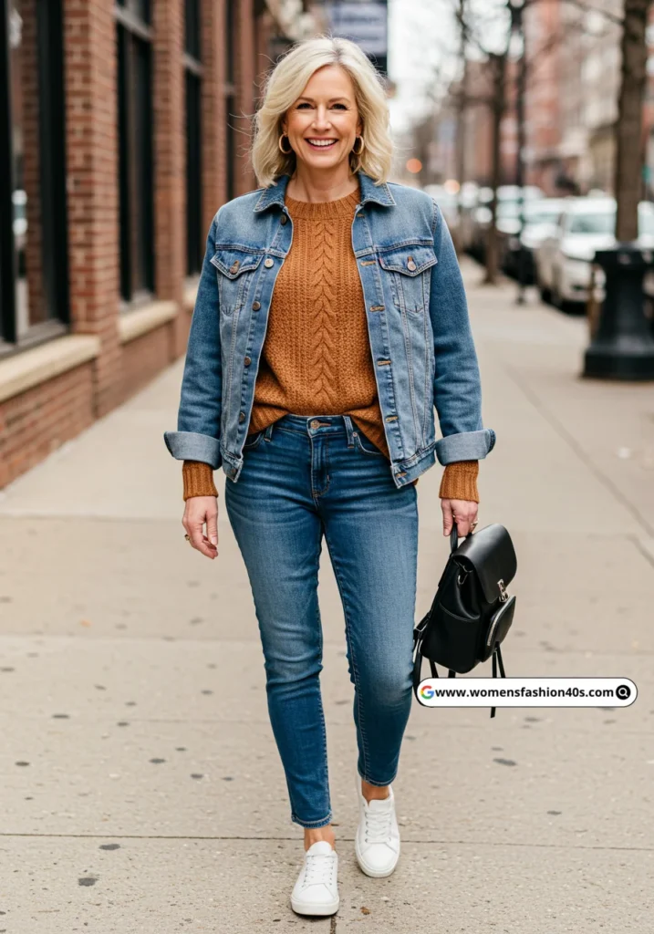 I tried this in Austin for a weekend stroll—it felt playful yet age-appropriate. Pinterest reports denim skirts trending +30% in spring, proving this outfit is both youthful and chic.