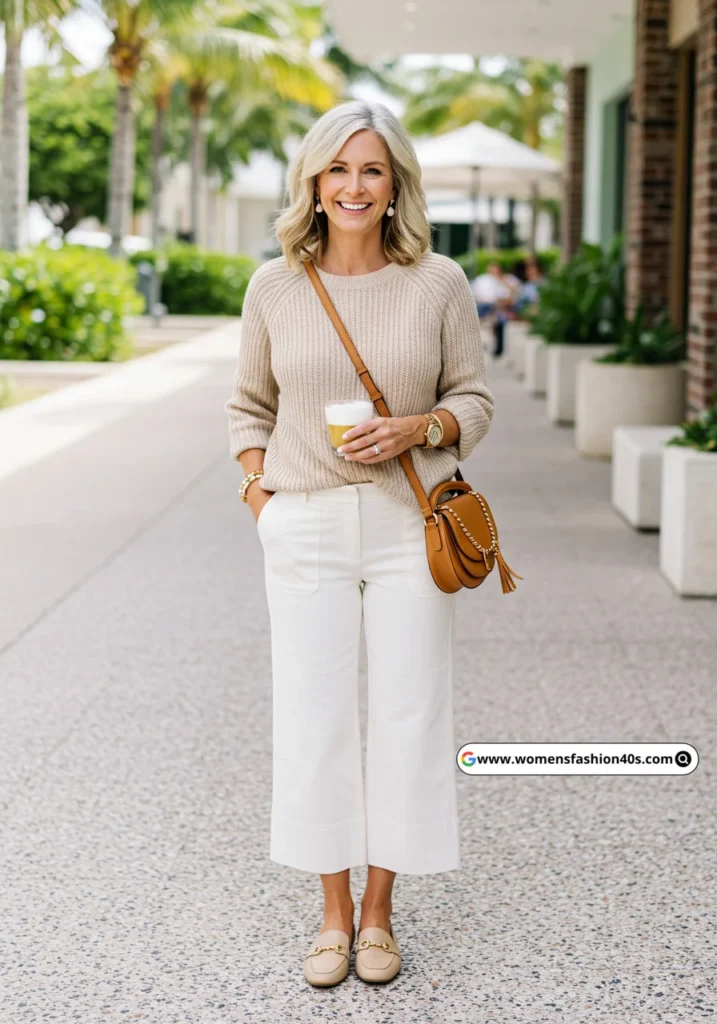 3. Beige Knit Sweater with White Wide-Leg Pants