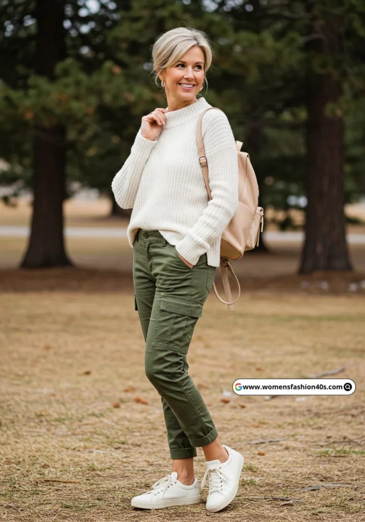 This was my adventurous look for a weekend in Denver—comfort meets edge. Google Trends shows “cargo pants outfits over 40” gaining traction, and the sweater adds softness to balance the utility vibe.