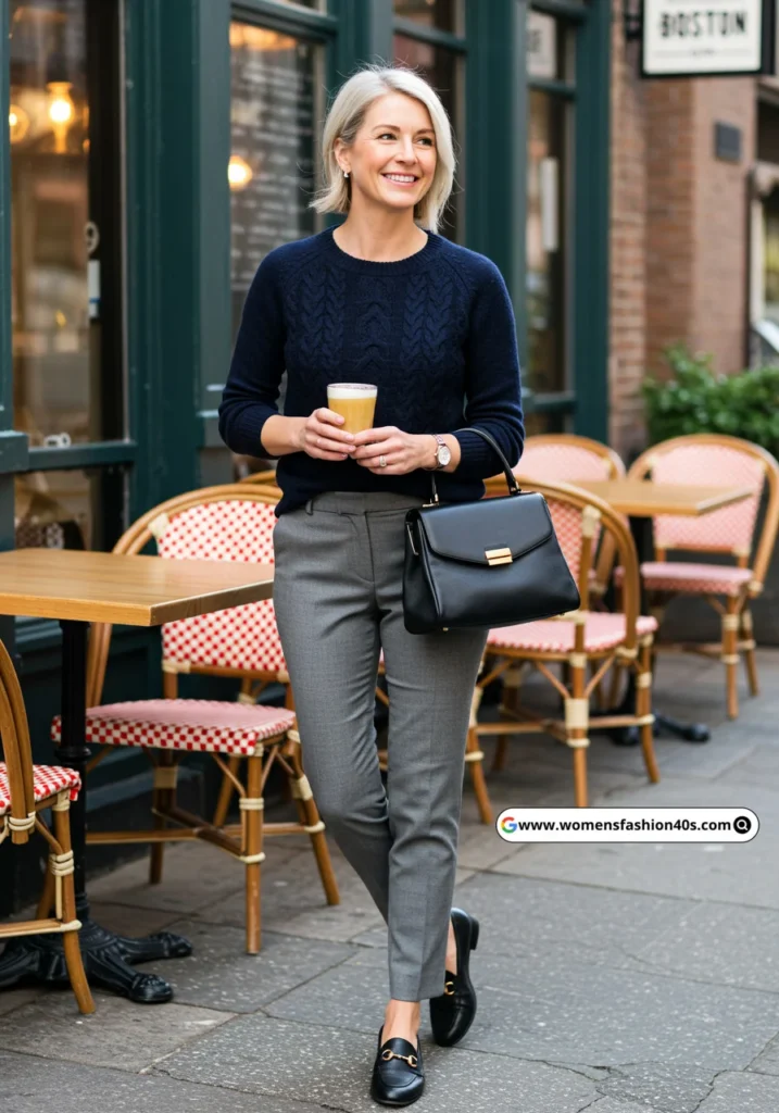 A polished outfit I wore to a Boston coffee shop meeting. Statista shows tailored trousers remain top-sellers among 40+ women, and the knit sweater for over 40 women makes it feel approachable.