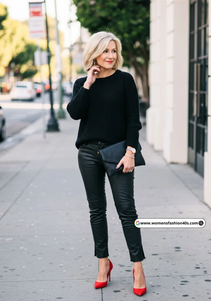 Shop Now from Amazon: Black Knit Sweater + Black Leather Pants + Red Pumps + Black Clutch