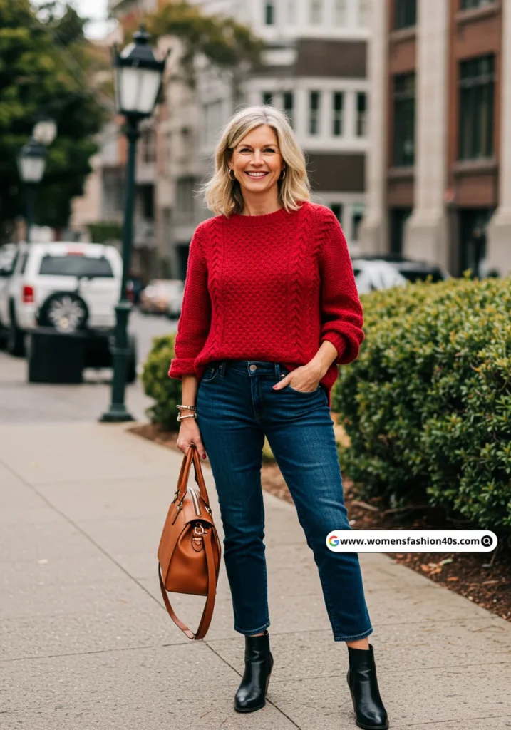 10. Red Knit Sweater with Dark Straight-Leg Jeans