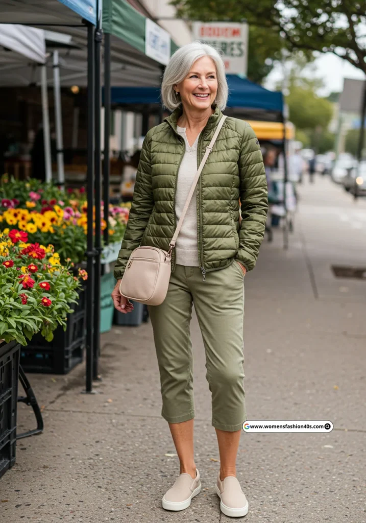 This olive green puffer jacket is my go-to for casual errands. It’s easy to pack for trips and keeps me cozy without bulk. Pairing it with capri pants, slip-on sneakers, and a crossbody bag makes the outfit effortless yet stylish for running around town.