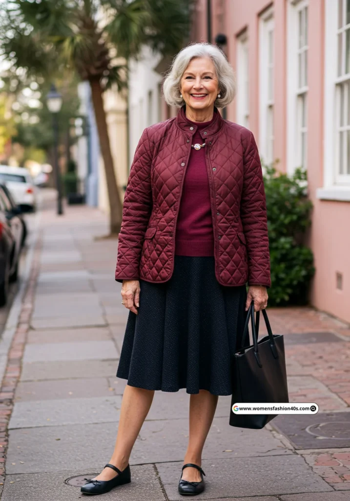 Shop Now from Amazon: Lightweight Puffer Jacket in Burgundy with Quilted Design + Burgundy with A-Line Skirt + Black with Mary Jane Flats + Black with Tote Bag