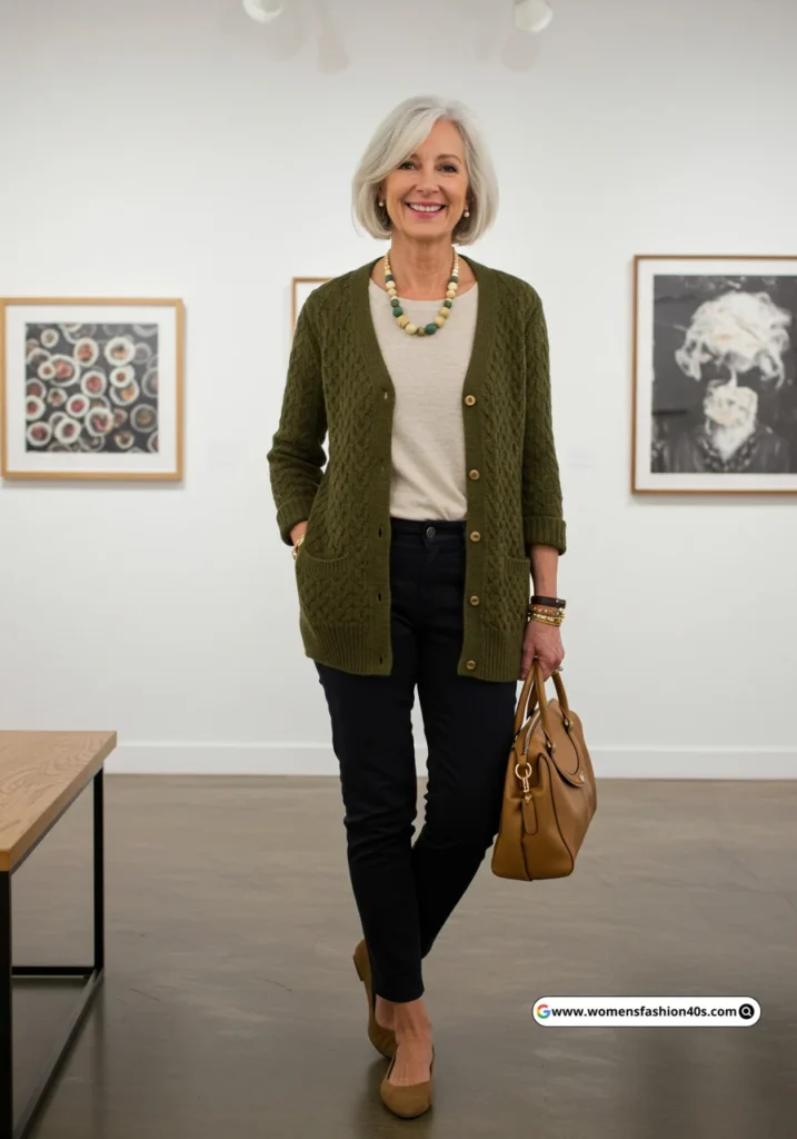 I styled this for a casual gallery walk in Chicago. Open-front cardigans with subtle patterns are Pinterest favorites for women over 60, offering versatile layering without sacrificing style.