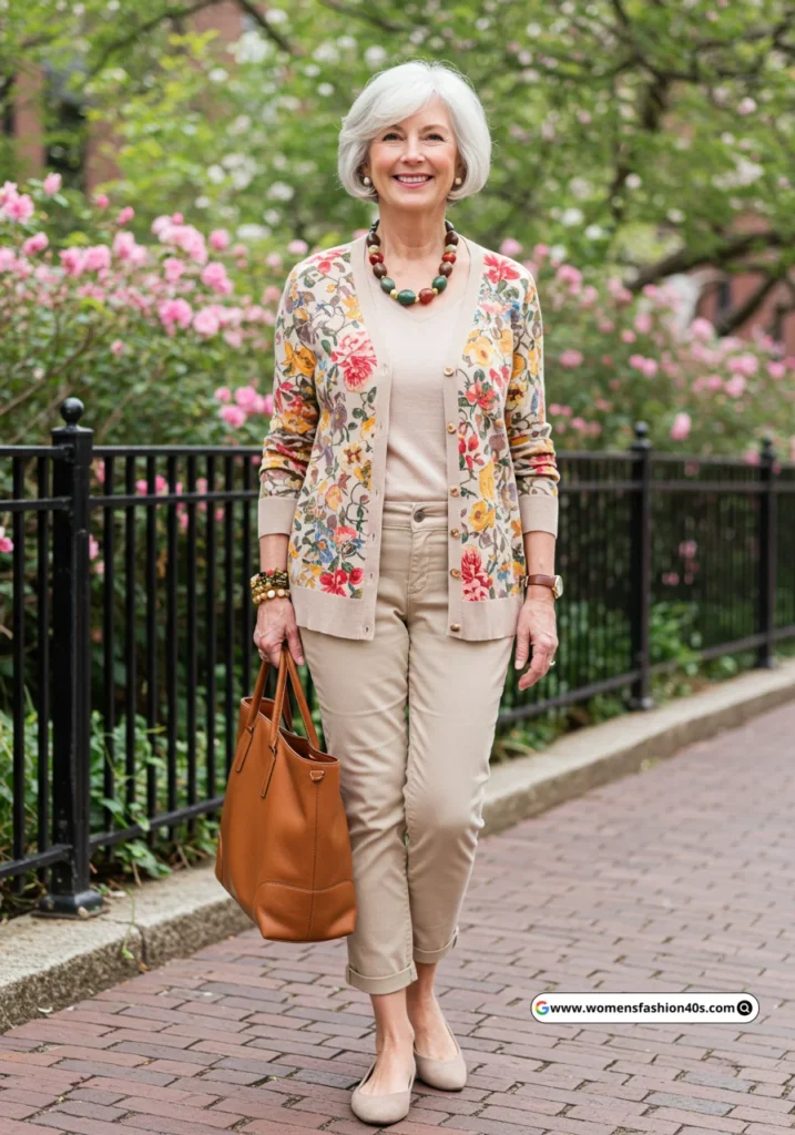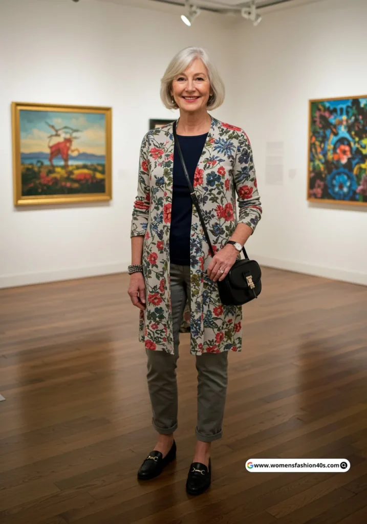I styled this for a casual art gallery visit in New York. Floral cardigans remain popular on Pinterest, adding subtle patterns that enhance everyday outfits for mature women.