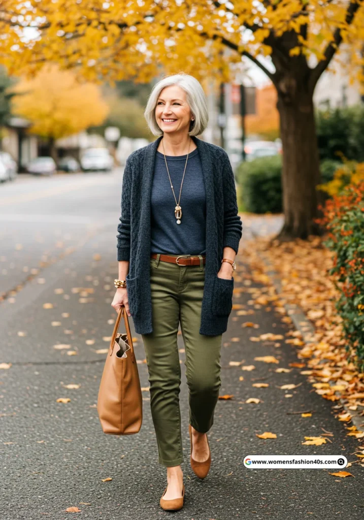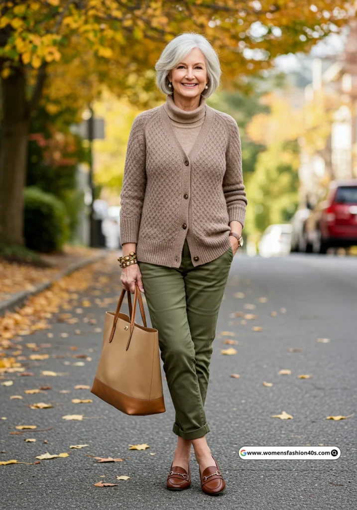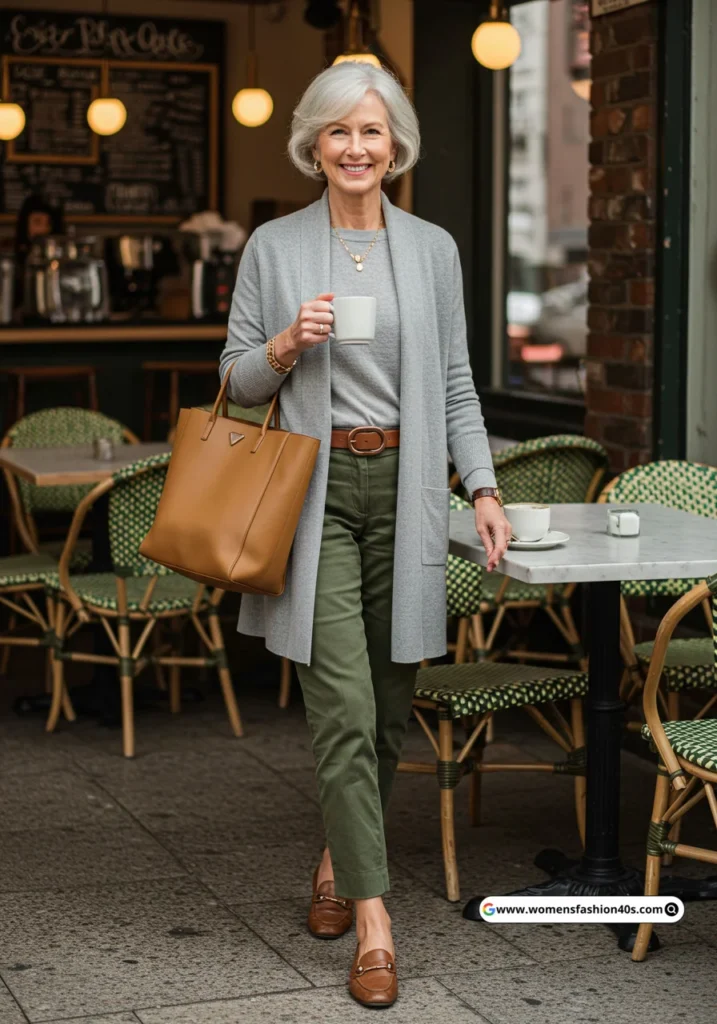 I styled this outfit for a relaxed gallery visit in Los Angeles. Google Trends indicates olive and earthy tones are trending for mature women seeking chic, low-maintenance outfits.