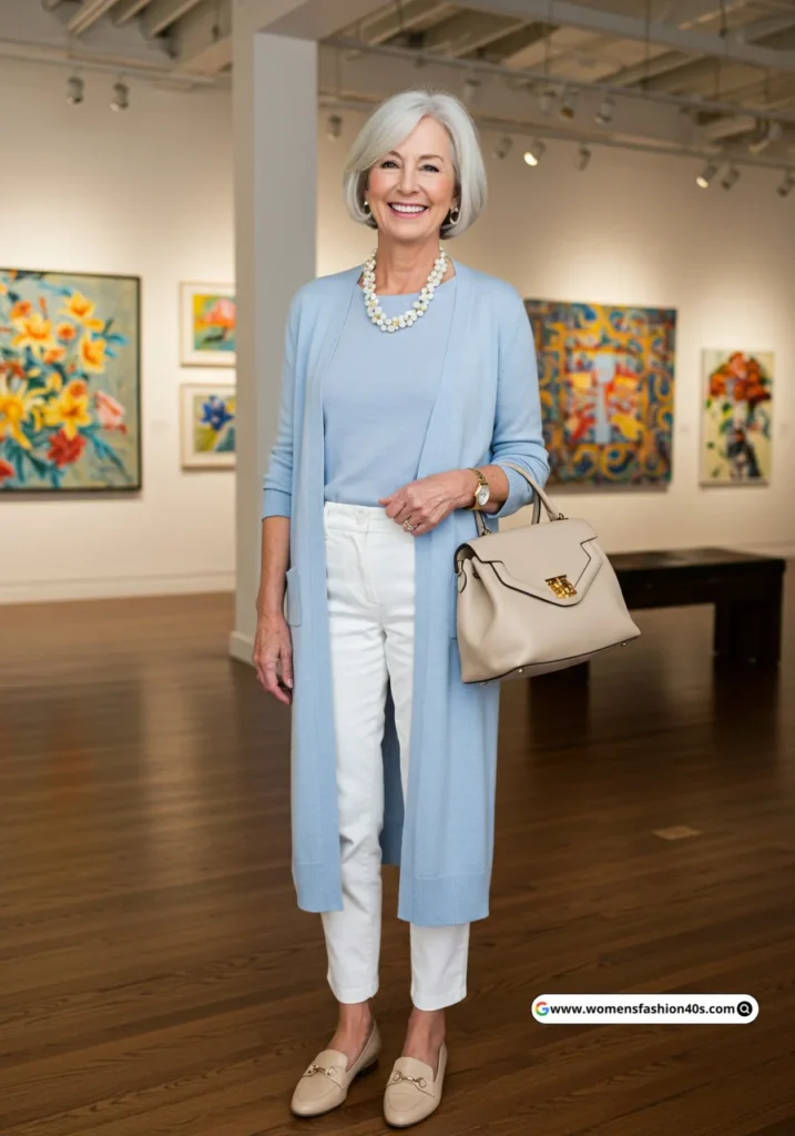 I styled this for an afternoon art gallery in LA. Beige longline cardigans continue trending for women over 60, offering effortless, timeless elegance.
