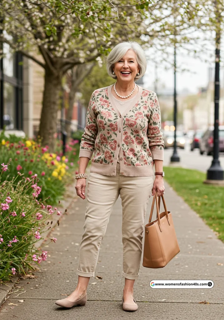I wore this for a weekend brunch in Portland. Floral knit cardigans are Pinterest favorites, giving mature women playful prints with effortless styling flexibility.