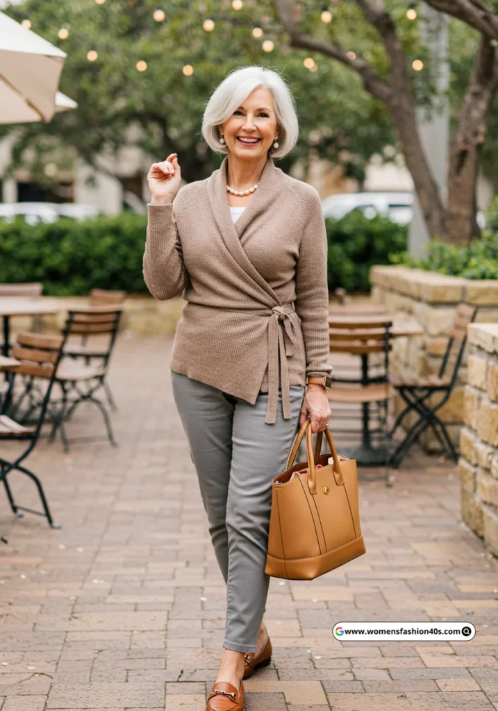 I wore this for a casual lunch in San Francisco. Wrap-style cardigans are trending for women over 60, combining a flattering silhouette with comfortable sophistication.